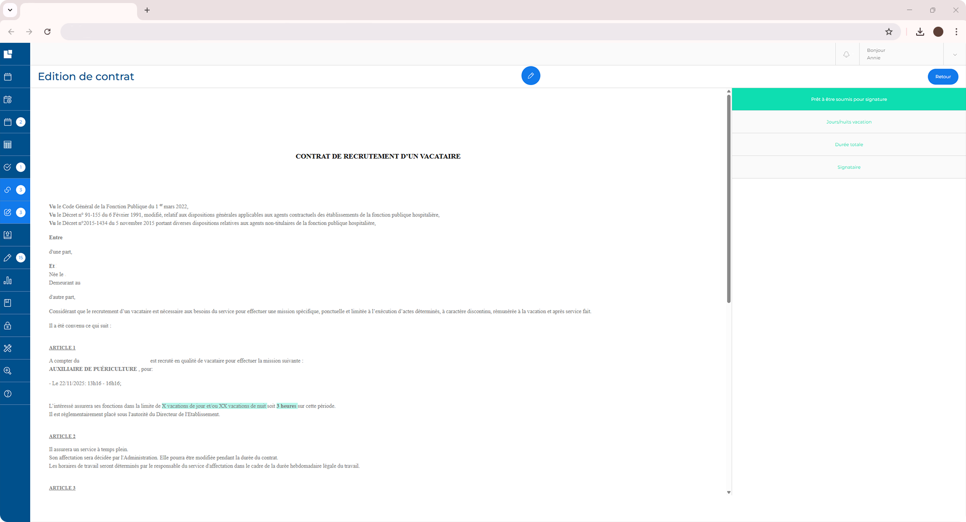 STAFFELIO génère des contrats pré-remplis avec les informations liées à la mission, à la rémunération et au remplaçant.